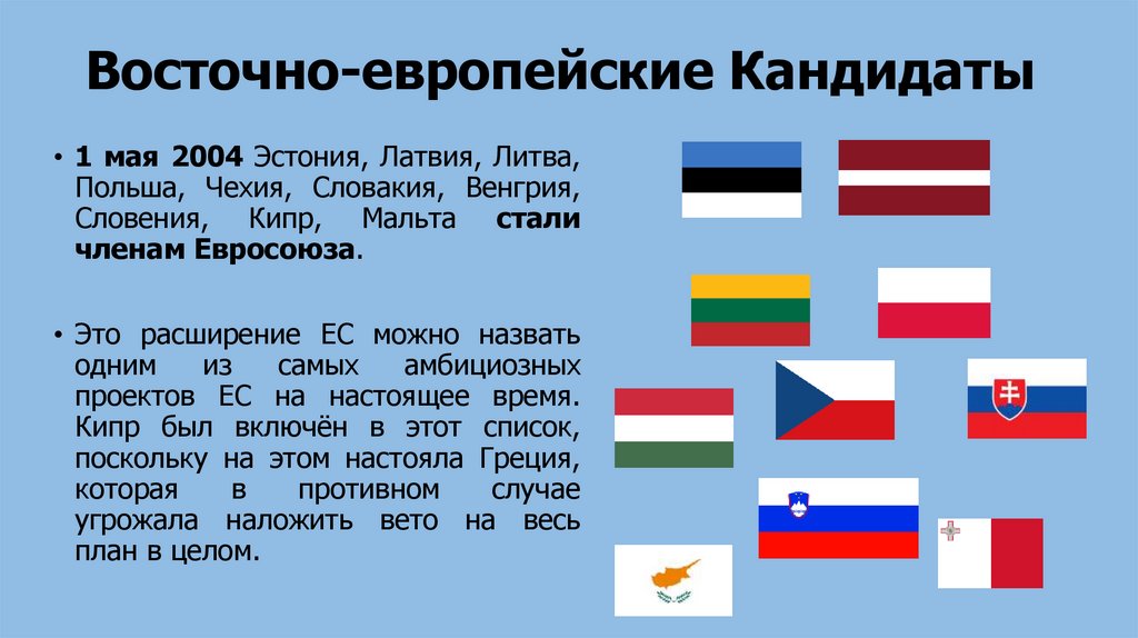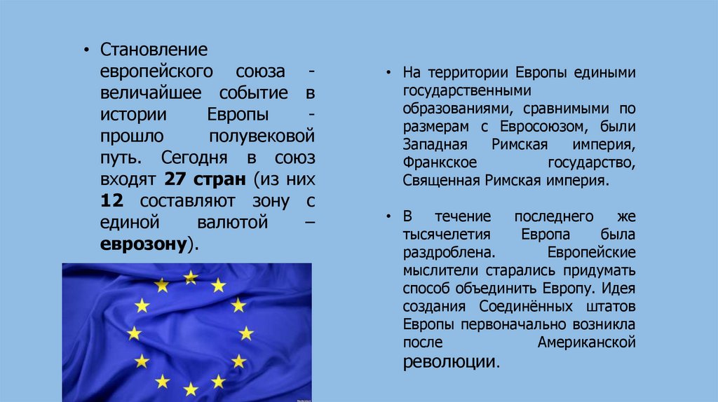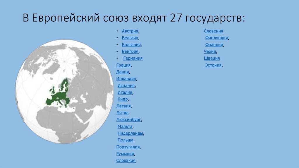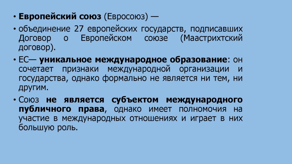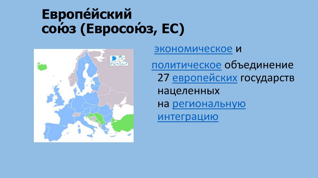• Европейский союз (Евросоюз) —• объединение 27 европейских государств, подписавших