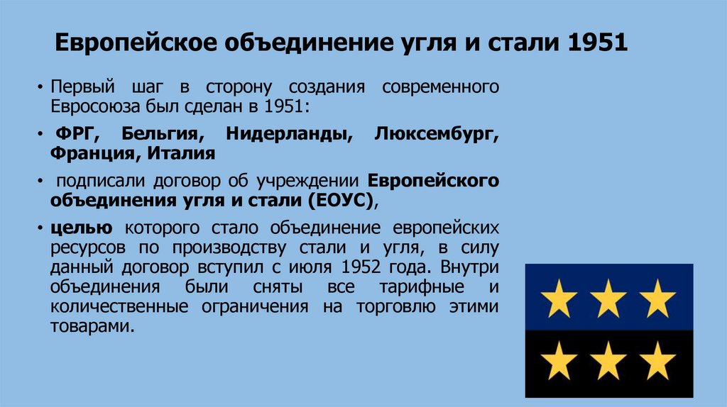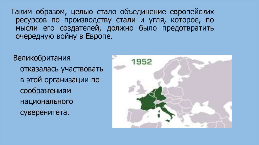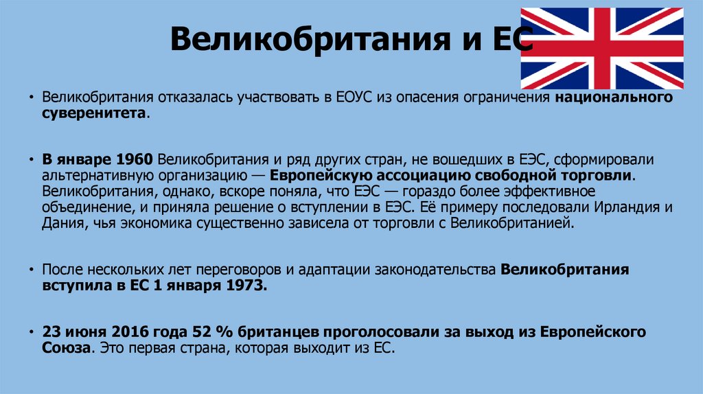 Великобритания и ЕС• Великобритания отказалась участвовать в ЕОУС из опасения ограничения национального