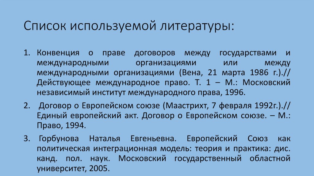 Список используемой литературы:1. Конвенция о праве договоров между государствами и