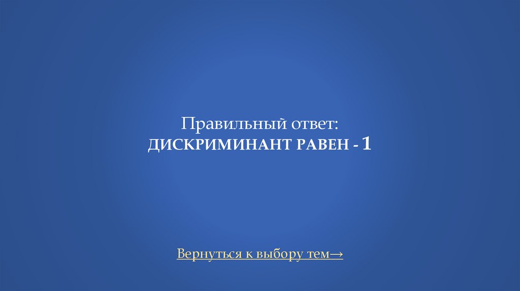 Правильный ответ:ДИСКРИМИНАНТ РАВЕН - 1