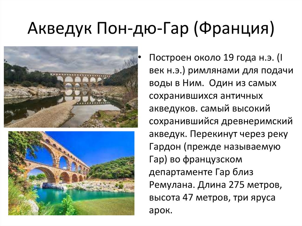 Акведук Пон-дю-Гар (Франция)• Построен около 19 года н.э. (I