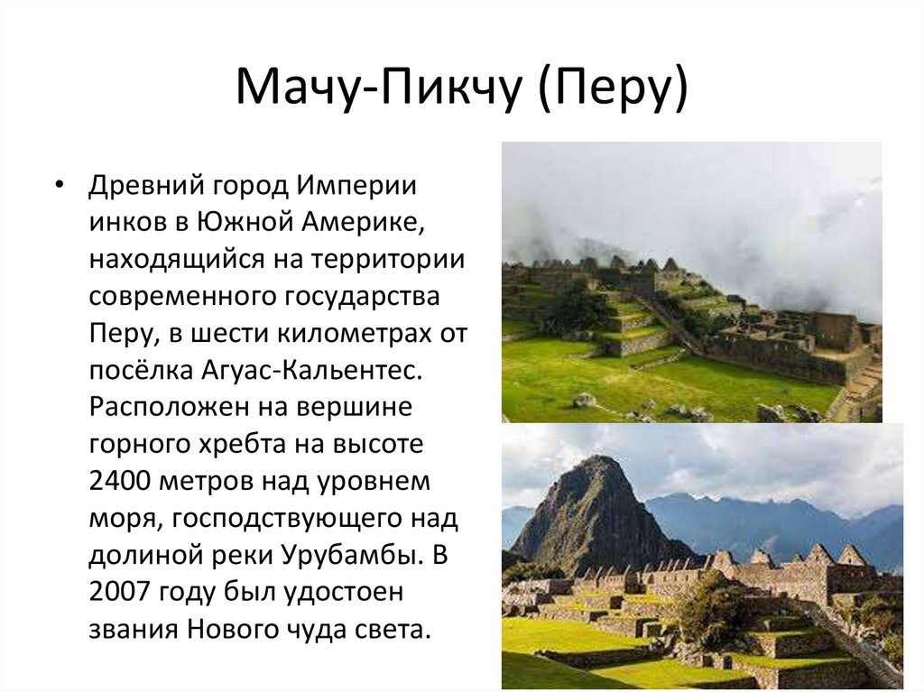 Мачу-Пикчу (Перу)• Древний город Империи