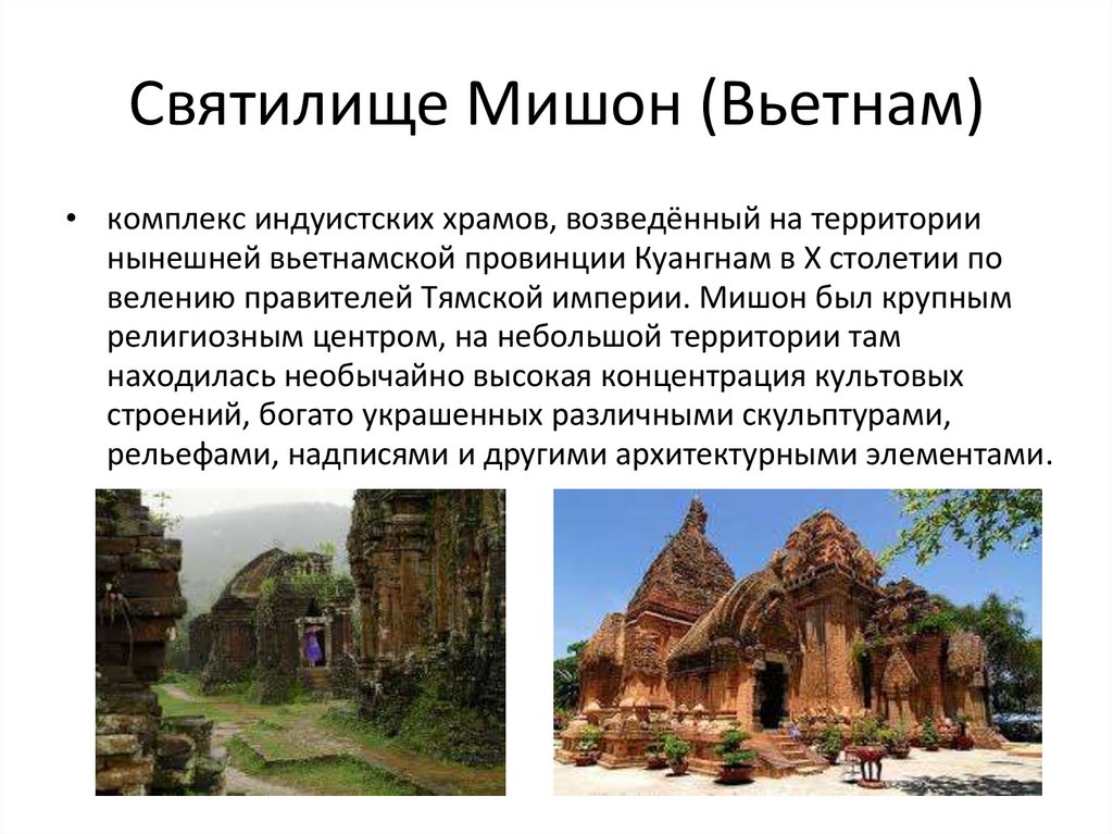 Святилище Мишон (Вьетнам)• комплекс индуистских храмов, возведённый на территории