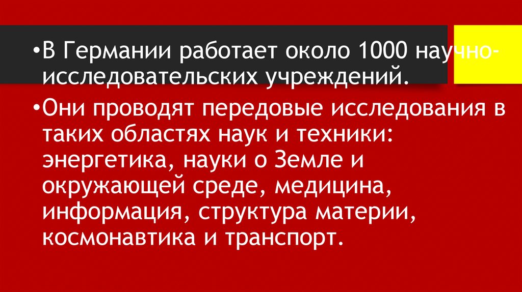 •В Германии работает около 1000 научноисследовательских учреждений.•Они проводят передовые исследования в