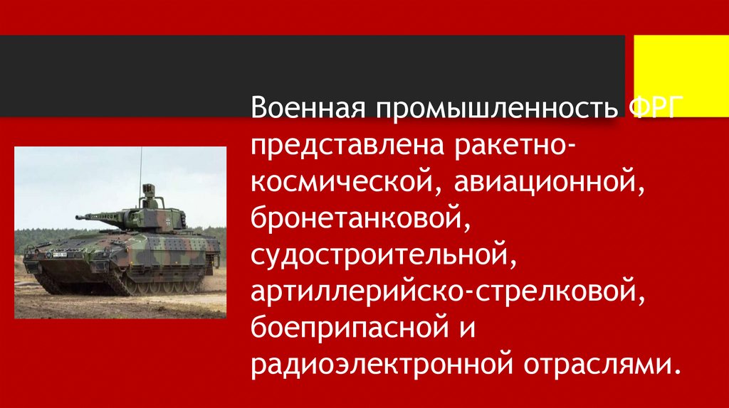 Военная промышленность ФРГпредставлена ракетнокосмической, авиационной,