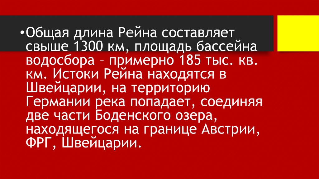•Общая длина Рейна составляетсвыше 1300 км, площадь бассейна