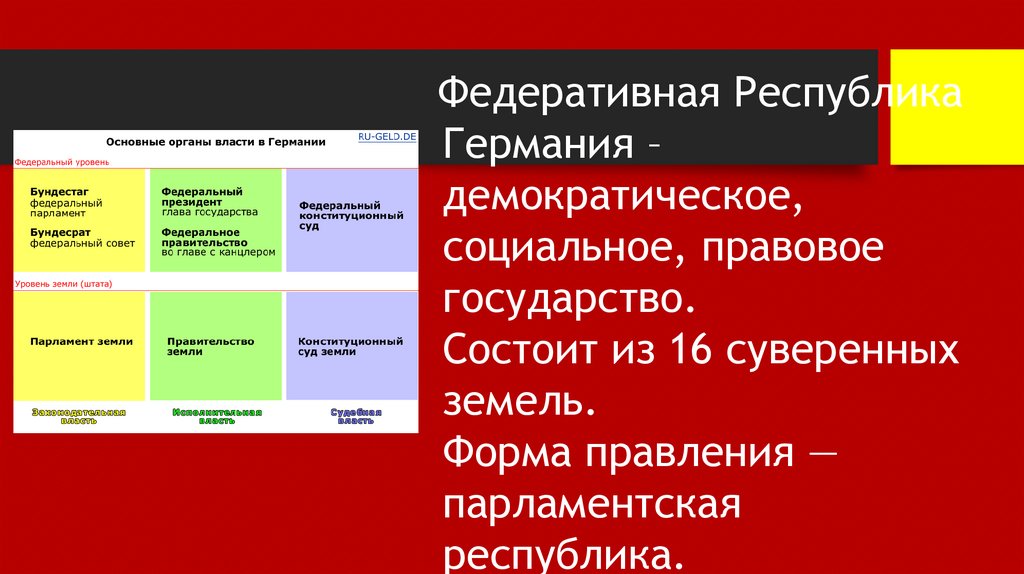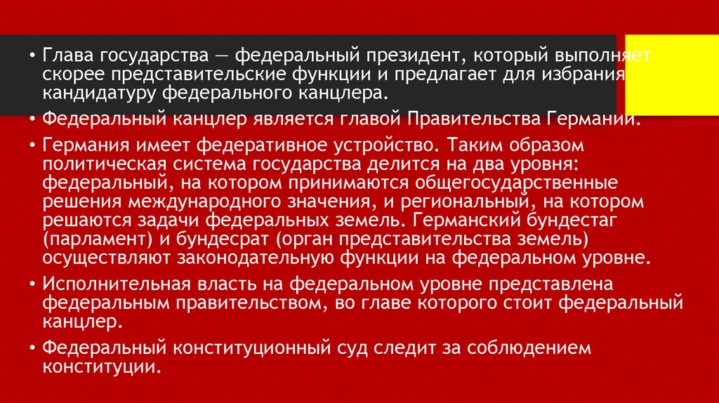• Глава государства — федеральный президент, который выполняетскорее представительские функции и предлагает для избрания