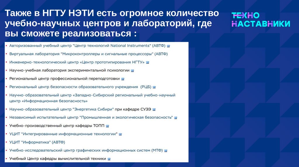 Также в НГТУ НЭТИ есть огромное количествоучебно-научных центров и лабораторий, где