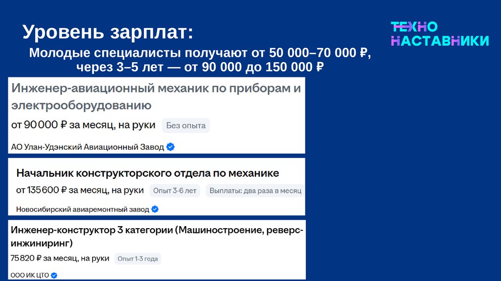 Уровень зарплат:Молодые специалисты получают от 50 000–70 000 ₽,