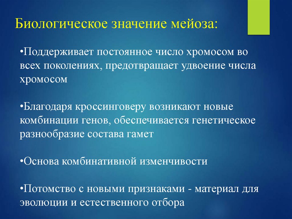 Биологическое значение мейоза:•Поддерживает постоянное число хромосом во