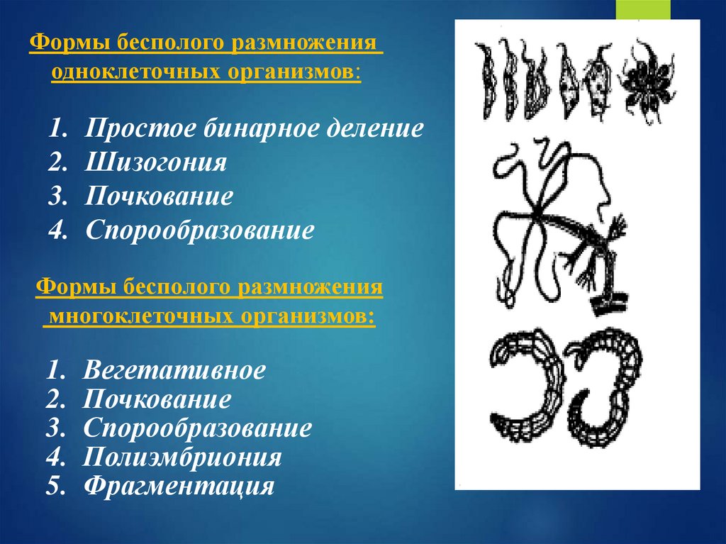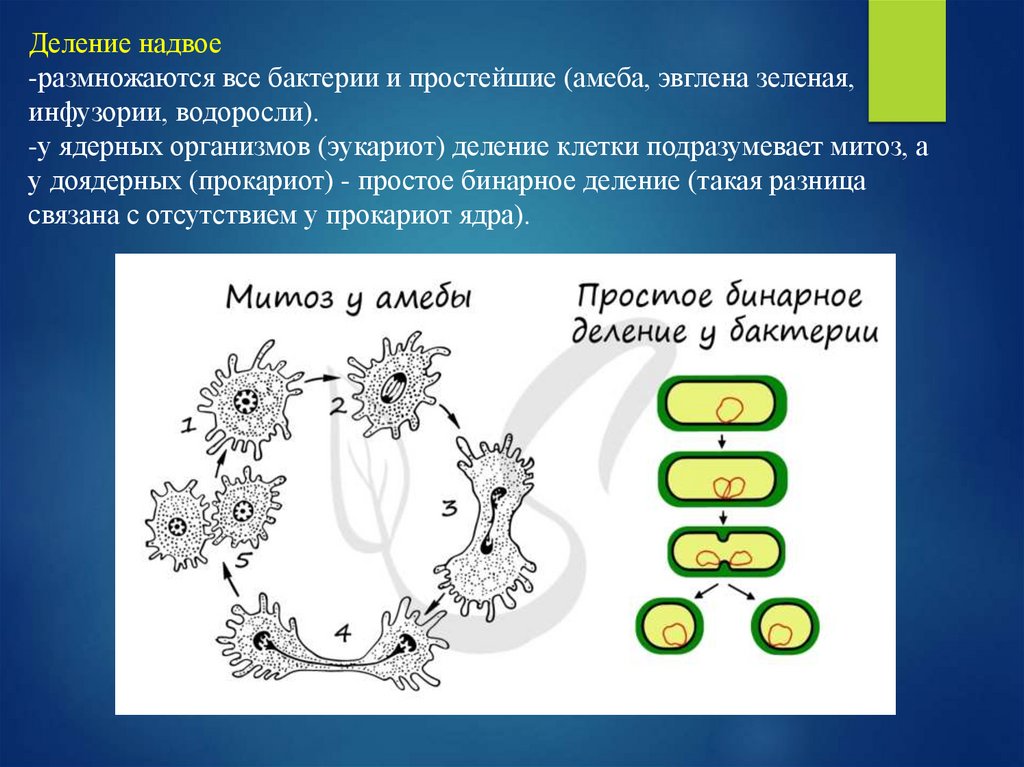 Деление надвое-размножаются все бактерии и простейшие (амеба, эвглена зеленая,