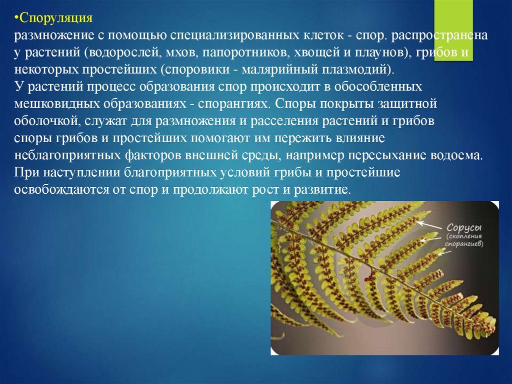 •Споруляцияразмножение с помощью специализированных клеток - спор. распространена