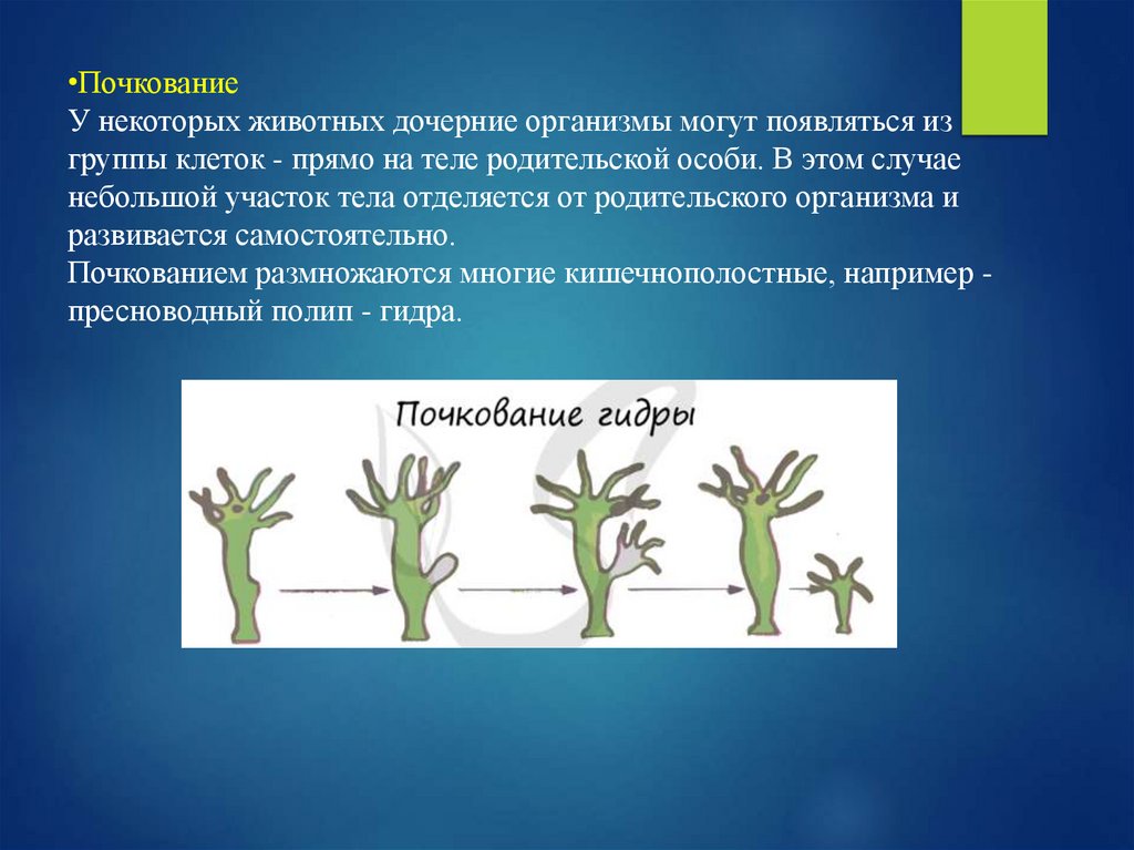 •ПочкованиеУ некоторых животных дочерние организмы могут появляться из