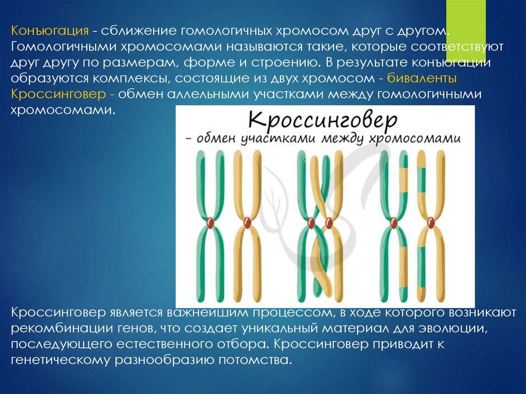 Конъюгация - сближение гомологичных хромосом друг с другом.Гомологичными хромосомами называются такие, которые соответствуют