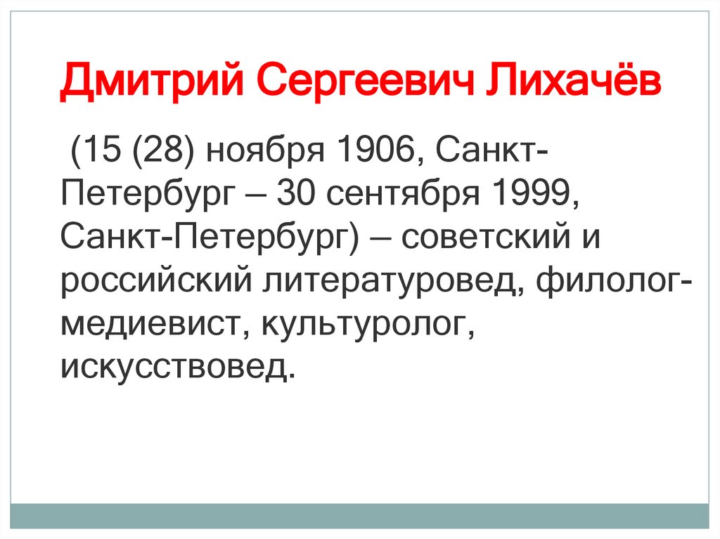 Дмитрий Сергеевич Лихачёв(15 (28) ноября 1906, СанктПетербург — 30 сентября 1999,