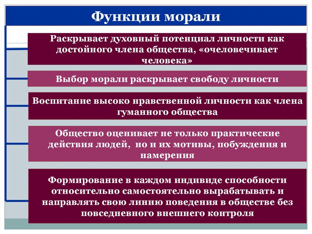 Функции моралиРаскрывает духовный потенциал личности как