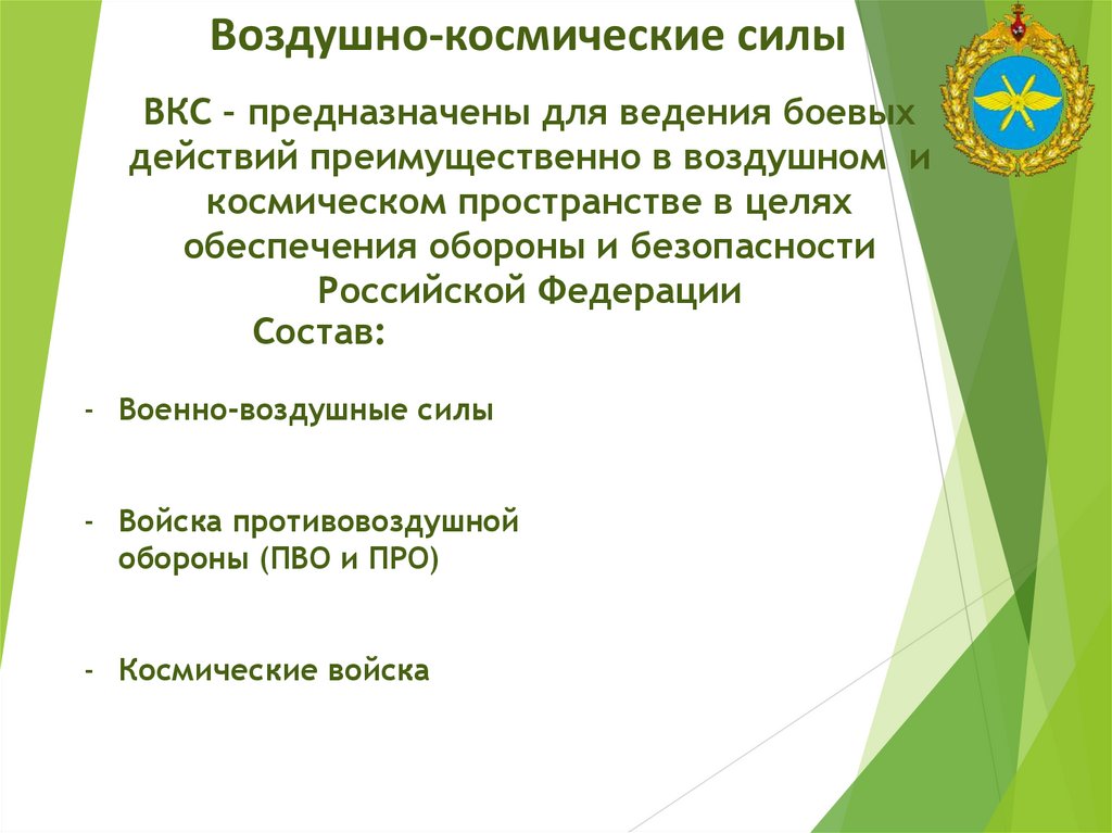 Воздушно-космические силыВКС – предназначены для ведения боевых