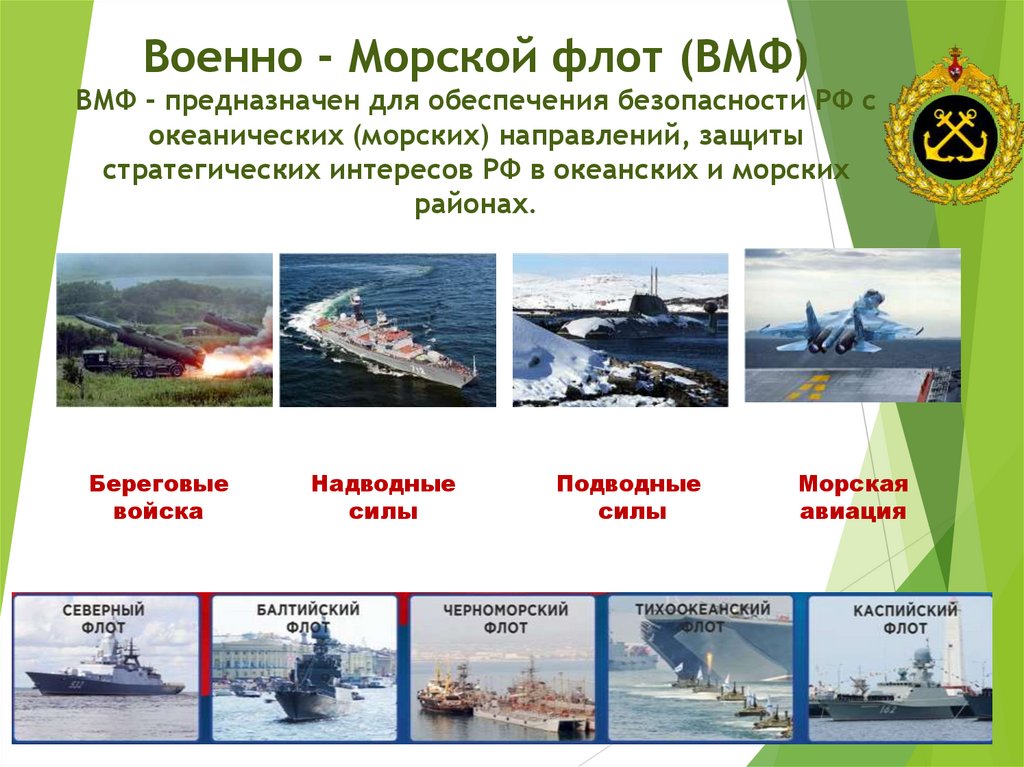 Военно - Морской флот (ВМФ)ВМФ - предназначен для обеспечения безопасности РФ с