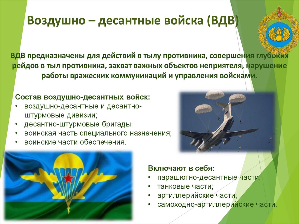 Воздушно – десантные войска (ВДВ)ВДВ предназначены для действий в тылу противника, совершения глубоких