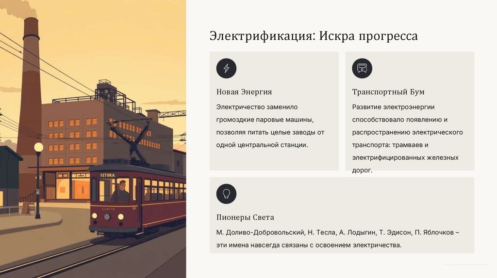 М. Доливо-Добровольский, Н. Тесла, А. Лодыгин, Т. Эдисон, П. Яблочков –