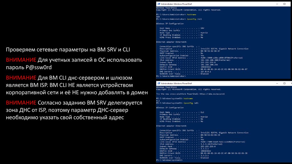 Проверяем сетевые параметры на ВМ SRV и CLIВНИМАНИЕ Для учетных записей в ОС использовать