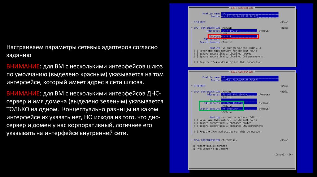 ВНИМАНИЕ: для ВМ с несколькими интерфейсов ДНСсервер и имя домена (выделено зеленым) указывается