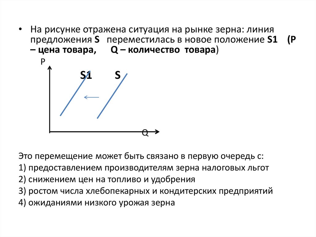 • На рисунке отражена ситуация на рынке зерна: линияпредложения S переместилась в новое положение S1 (P