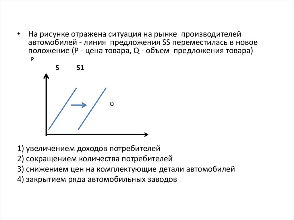 • На рисунке отражена ситуация на рынке производителейавтомобилей - линия предложения SS переместилась в новое