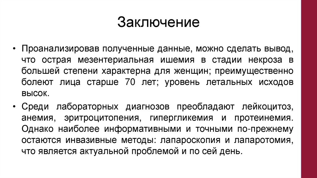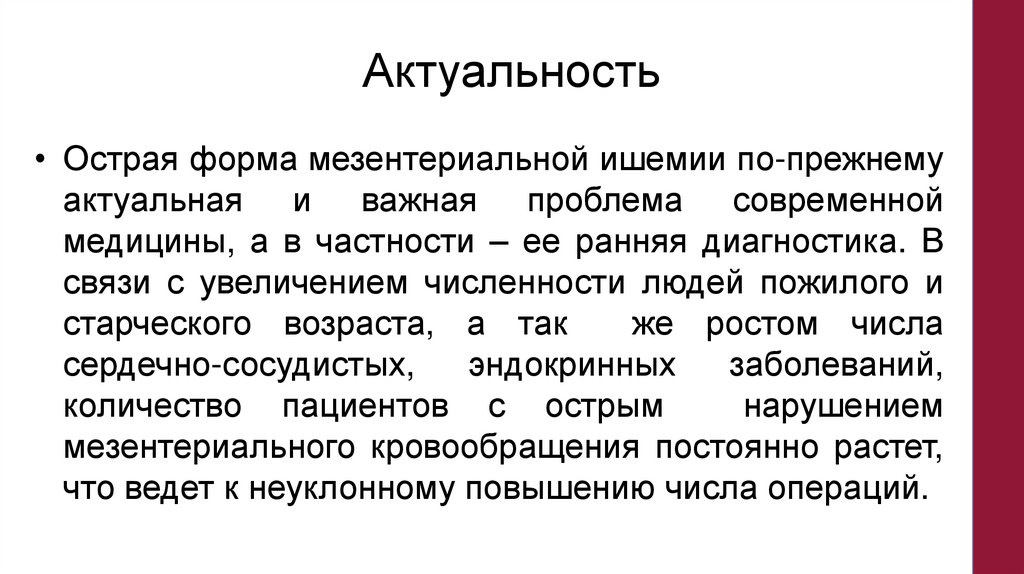 Актуальность• Острая форма мезентериальной ишемии по-прежнему