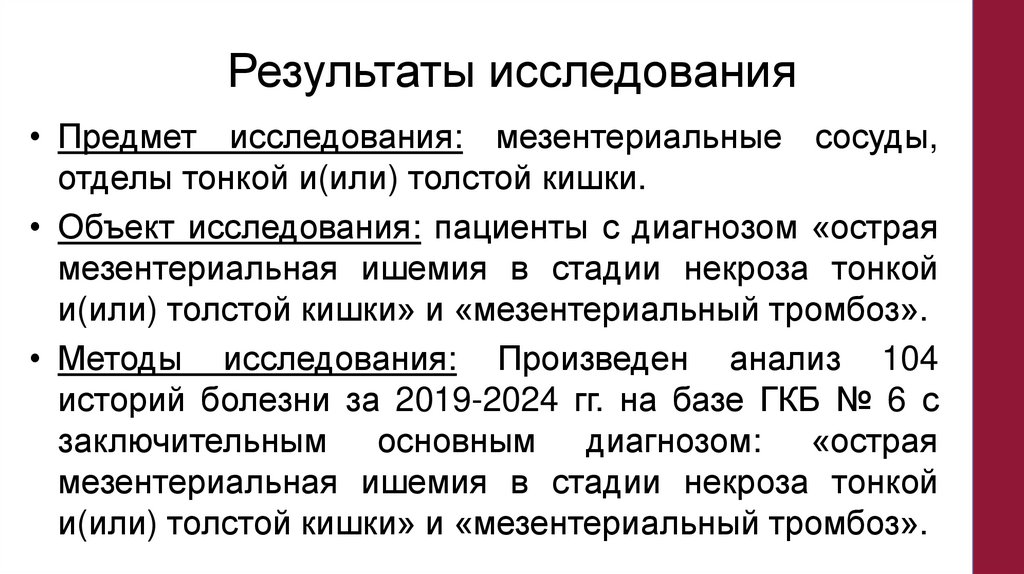Результаты исследования• Предмет исследования: мезентериальные сосуды,