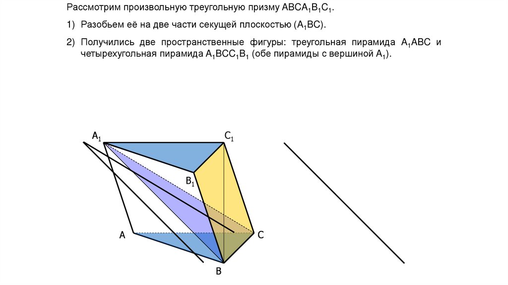 Рассмотрим произвольную треугольную призму ABCA1B1C1.1) Разобьем её на две части секущей плоскостью (A1BC).