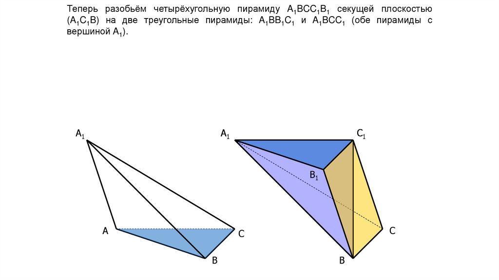 Теперь разобьём четырёхугольную пирамиду A1BCC1B1 секущей плоскостью(A1C1B) на две треугольные пирамиды: A1BB1C1 и A1BCC1 (обе пирамиды с
