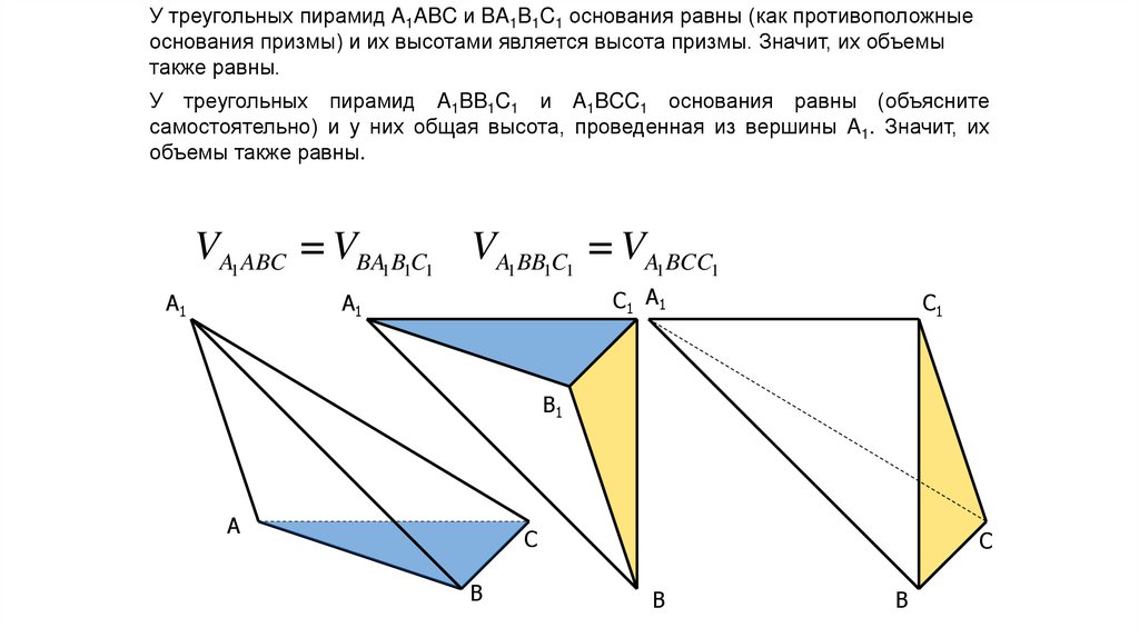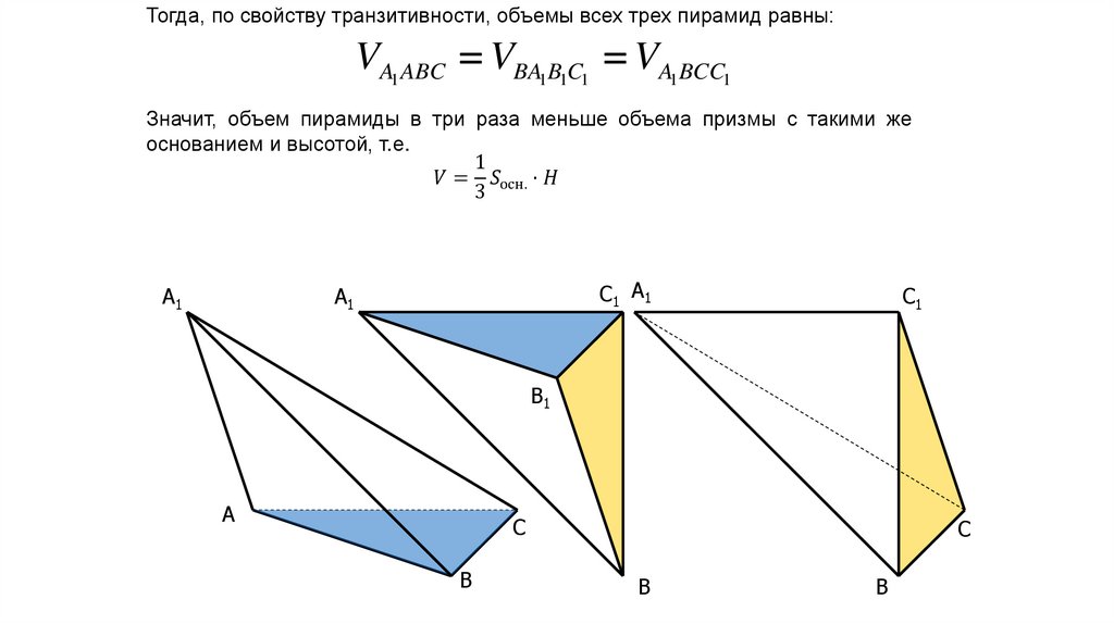 Тогда, по свойству транзитивности, объемы всех трех пирамид равны:VA1 ABC VBA1B1C1 VA1BCC1