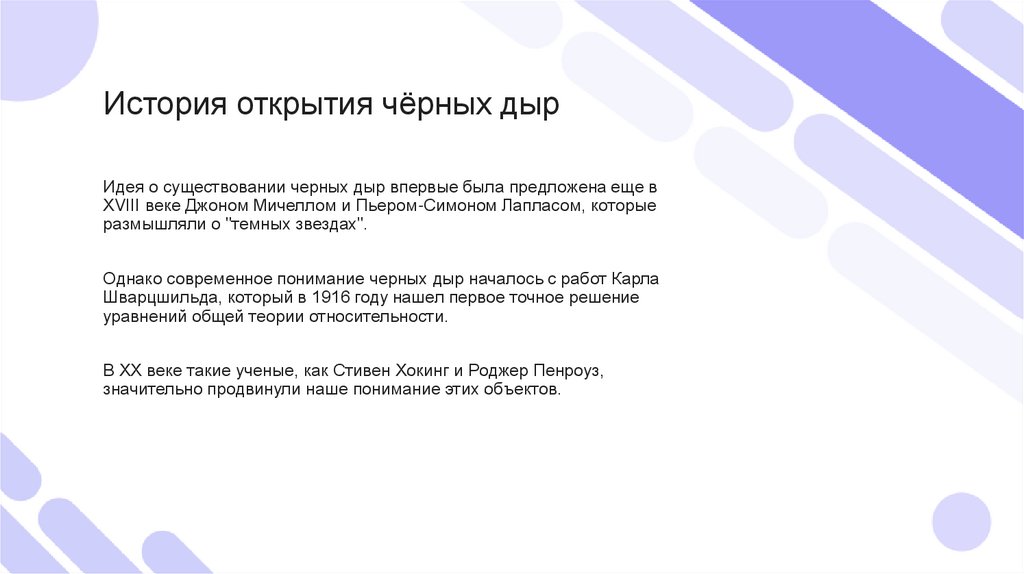 История открытия чёрных дырИдея о существовании черных дыр впервые была предложена еще в