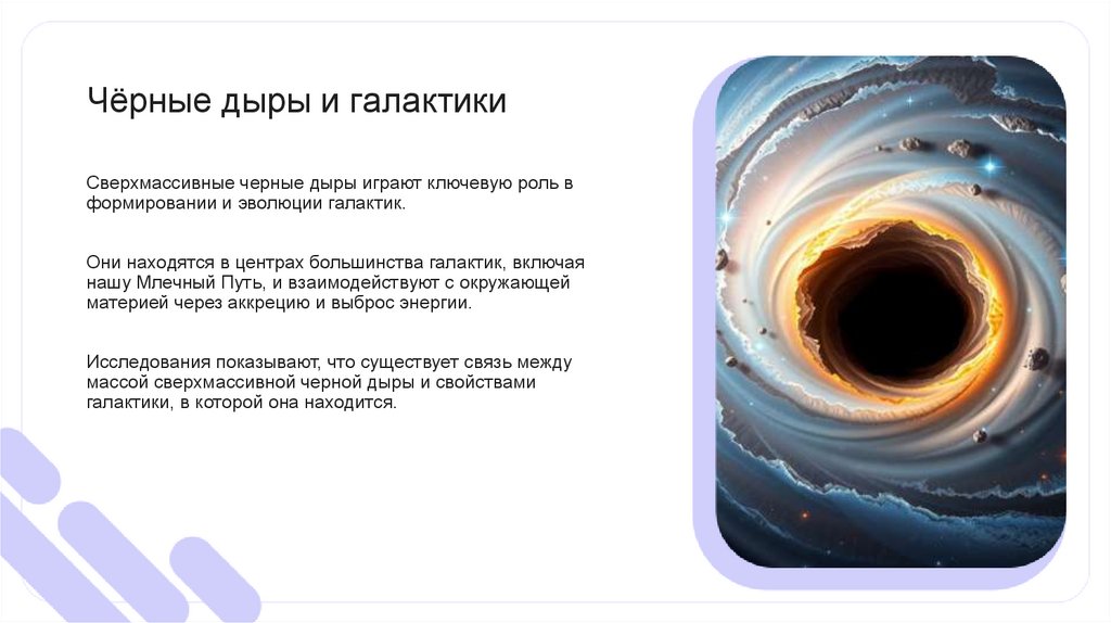 Чёрные дыры и галактикиСверхмассивные черные дыры играют ключевую роль в