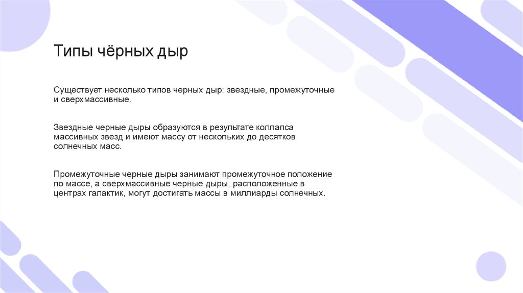 Типы чёрных дырСуществует несколько типов черных дыр: звездные, промежуточные