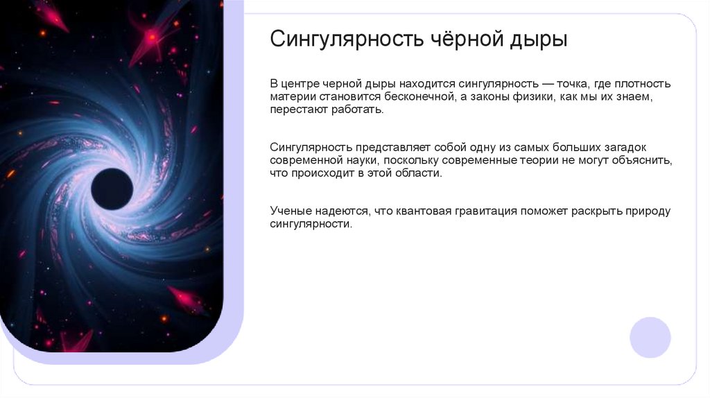 Сингулярность чёрной дырыВ центре черной дыры находится сингулярность — точка, где плотность
