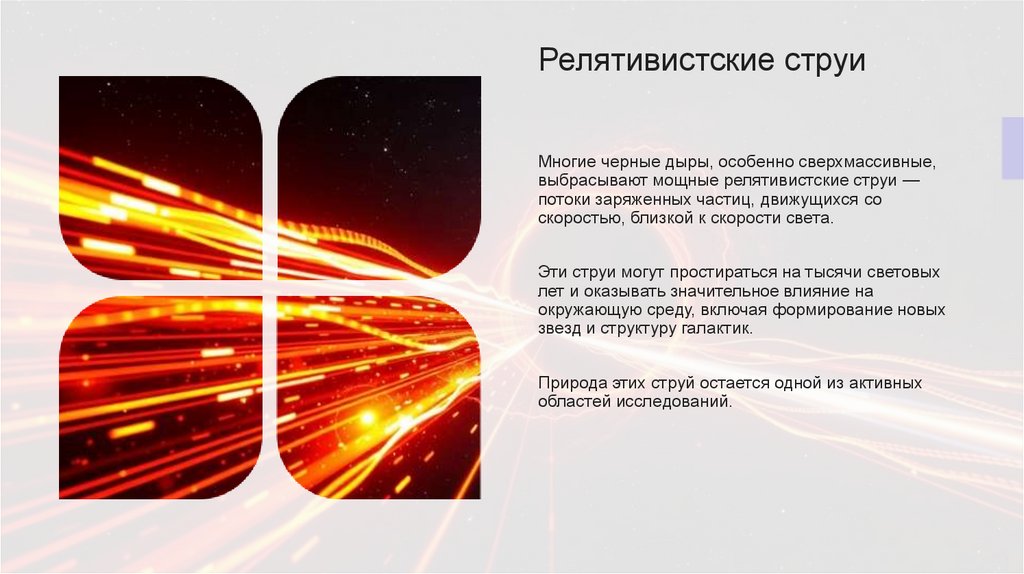 Релятивистские струиМногие черные дыры, особенно сверхмассивные,