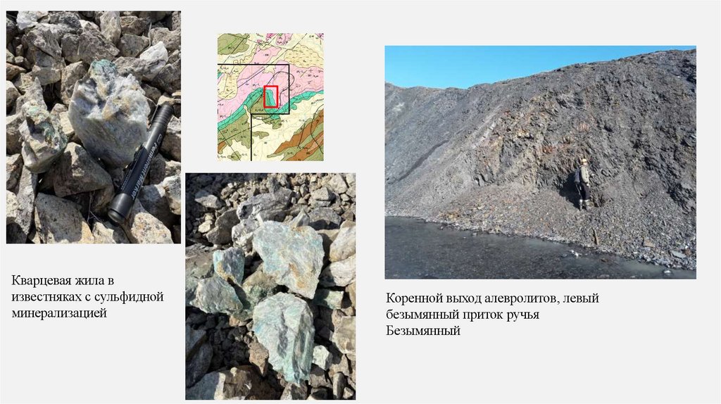 ПРОВЕДЕНИЕ РАБОТКоренной выход известняков, пронизанный кварцкарбонатными прожилками с сульфидной минерализацией,
