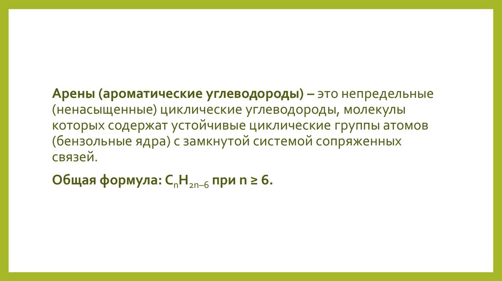 Арены (ароматические углеводороды) – это непредельные(ненасыщенные) циклические углеводороды, молекулы