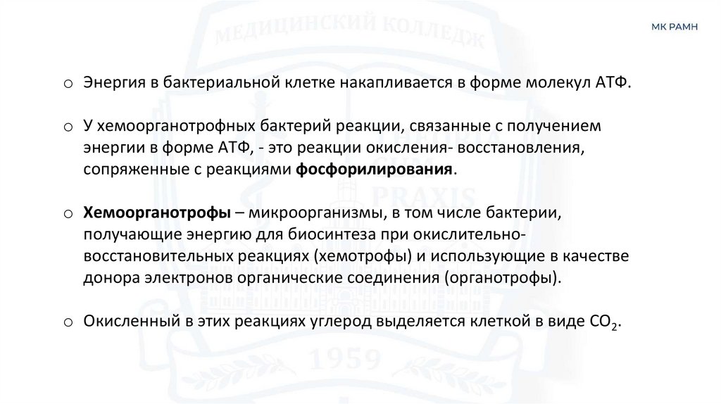 o Энергия в бактериальной клетке накапливается в форме молекул АТФ.o У хемоорганотрофных бактерий реакции, связанные с получением