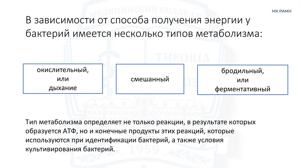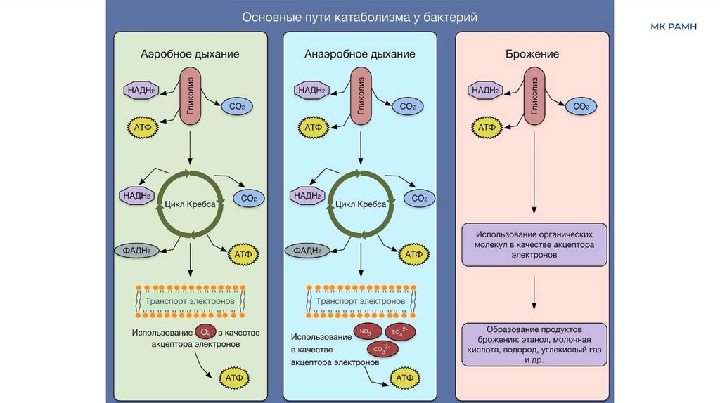 В зависимости от способа получения энергии убактерий имеется несколько типов метаболизма: