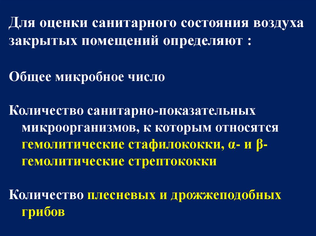 Для оценки санитарного состояния воздухазакрытых помещений определяют :