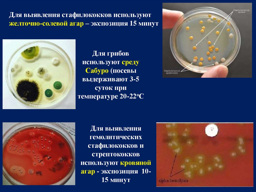 Для выявления стафилококков используютжелточно-солевой агар – экспозиция 15 минут