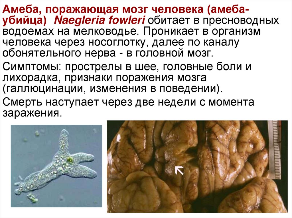 Амеба, поражающая мозг человека (амебаубийца) Naegleria fowleri обитает в пресноводныхводоемах на мелководье. Проникает в организм