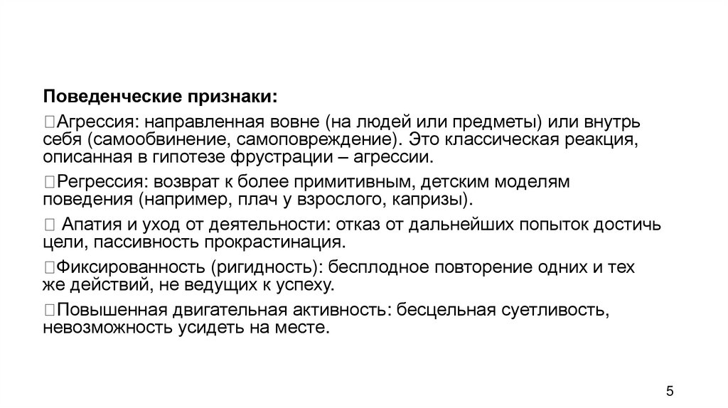 Поведенческие признаки:Агрессия: направленная вовне (на людей или предметы) или внутрь