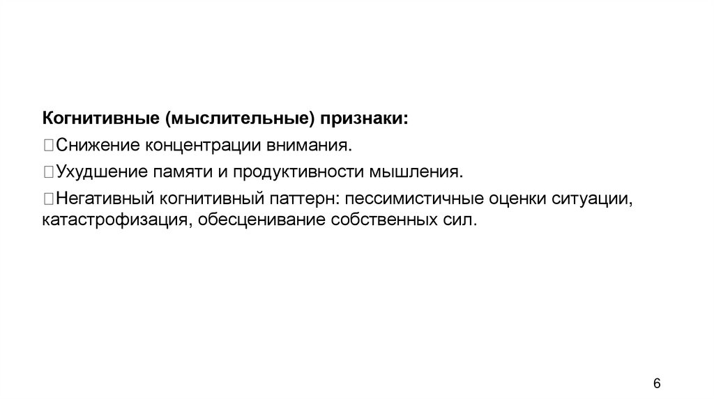 Когнитивные (мыслительные) признаки:Снижение концентрации внимания.