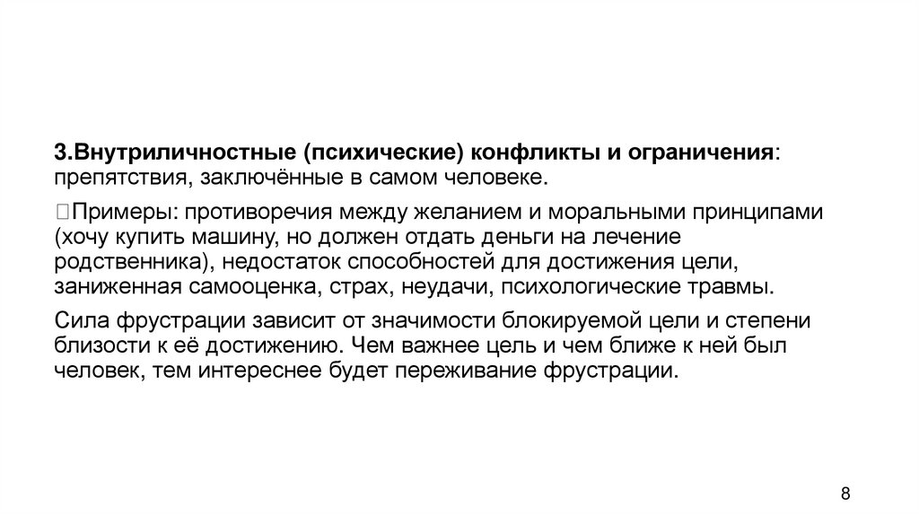 3.Внутриличностные (психические) конфликты и ограничения:препятствия, заключённые в самом человеке.