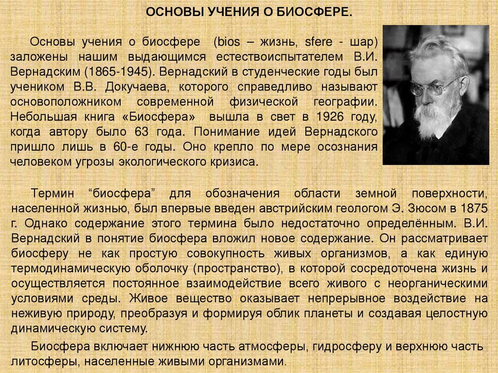 Вернадский в понятие биосфера вложил новое содержание. Он рассматривает