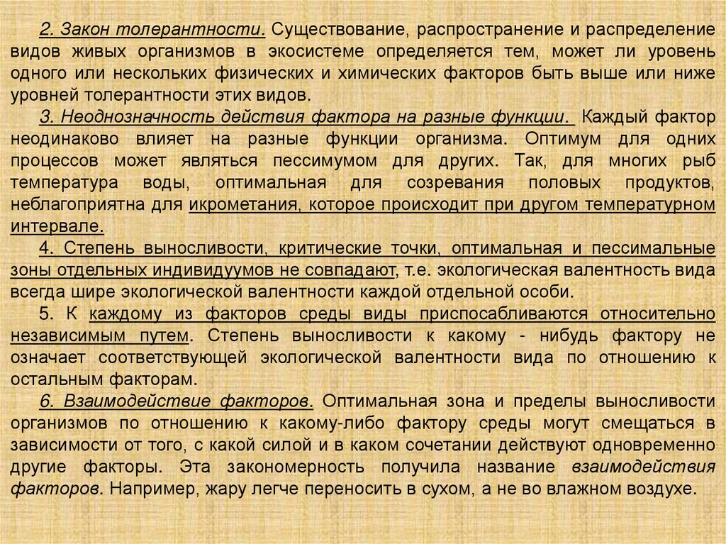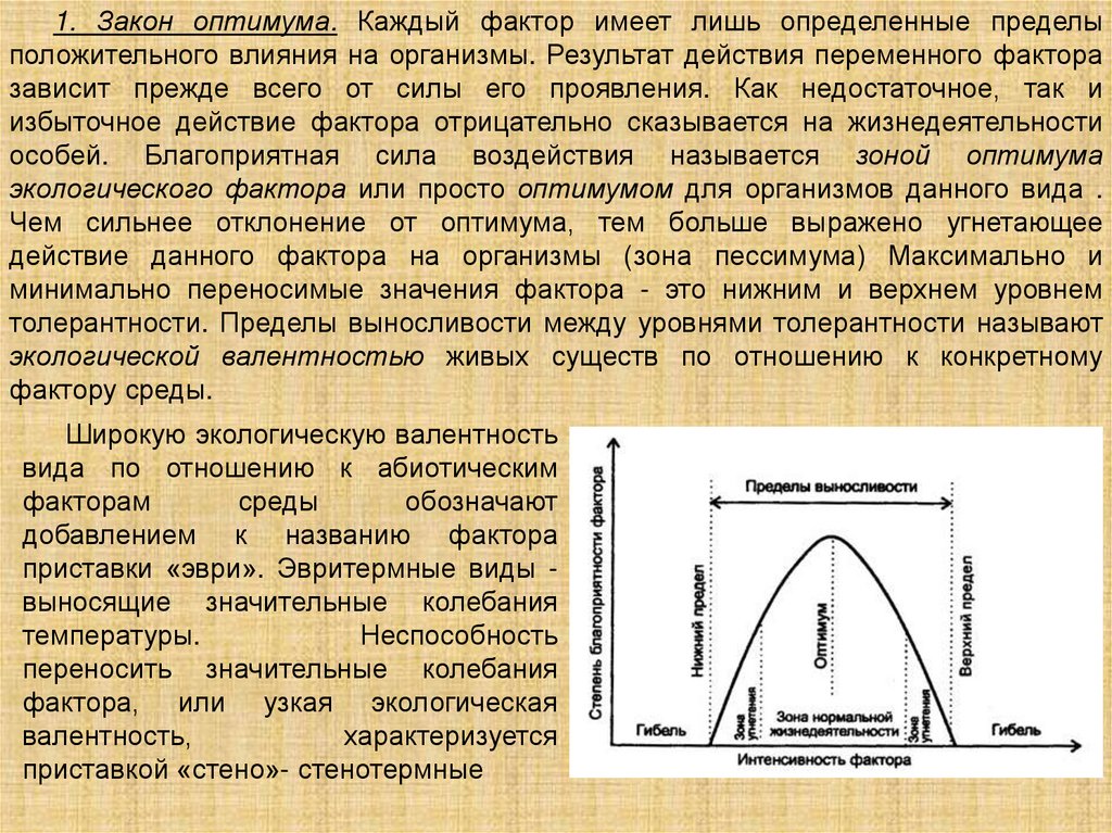 1. Закон оптимума. Каждый фактор имеет лишь определенные пределыположительного влияния на организмы. Результат действия переменного фактора